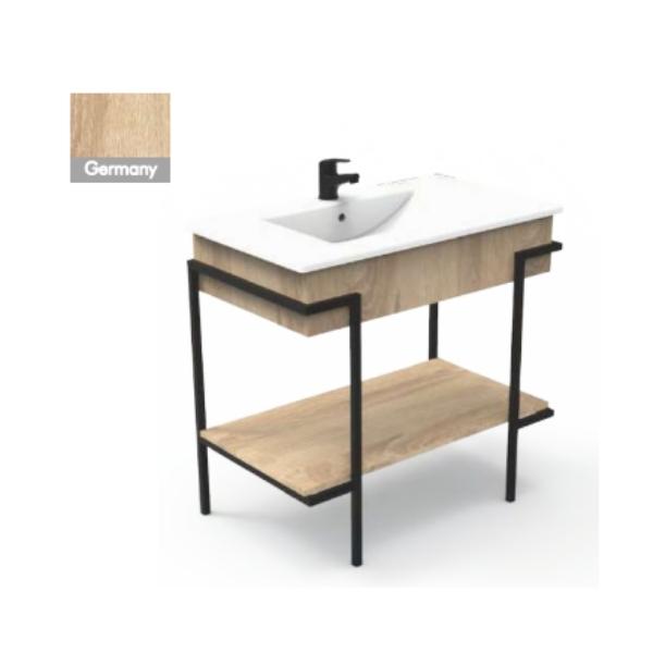 Mueble de baño a piso, con estructura metálica de 19 x 19 y una bandeja en la parte inferior.